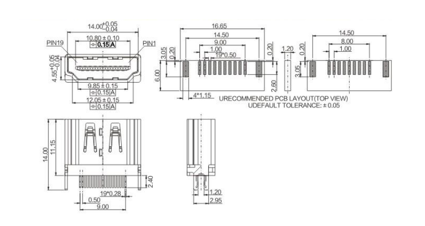 HDMI A TYPE母座180度夾板式08~1.6MM(外殼厚度T=0.50,端子彎端)