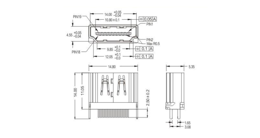 HDMI A TYPE母座180度夾板式0.8~1.6MM(外殼厚度T=0.40,端子彎端)