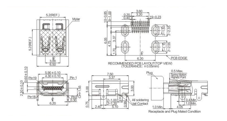 HDMI Type D 19Pin,板上型CH=1.55,雙排SMT,外殼前后插