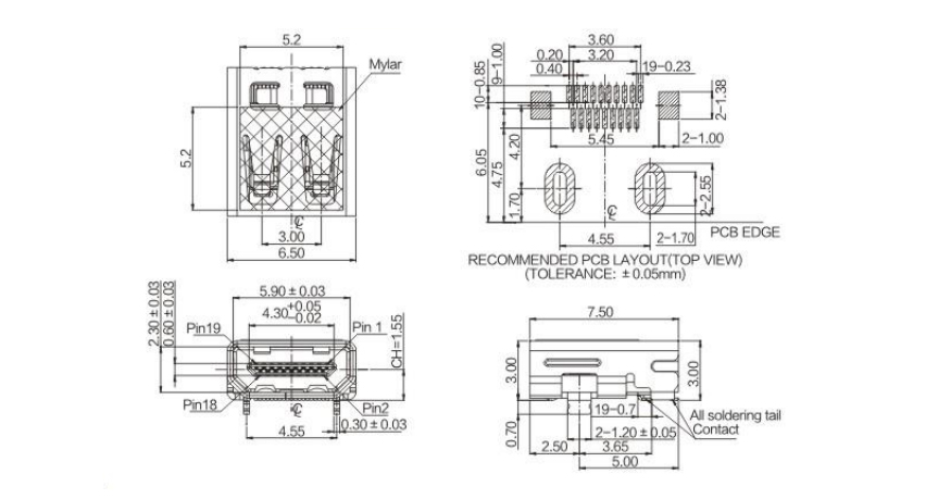 HDMI Type D 19Pin板上型CH=1.55雙排SMT外殼全貼